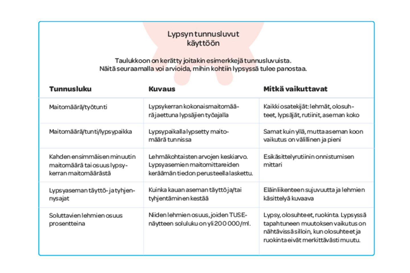 <br> Vakiintuneita Näin me ollaan aina tehty -rutiineja kannattaa tarkastella kriittisesti. Hyvän lypsyrutiinin kehittäminen ja ylläpitäminen on haaste tiloilla, joissa lehmien lypsystä vastaa useampi henkilö, sillä tilan kaikkien lypsäjien lypsyrutiinien tulisi olla samanlaiset. Lypsäjien työskentelyvälineiden ja -olosuhteiden tulisi olla sellaiset, että houkutus rikkoa yhdessä sovittuja rutiineja olisi mahdollisimman vähäinen.