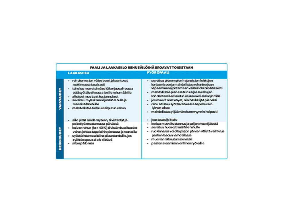 Rehunkorjuu laakasiiloon eroaa monella tapaa pyöröpaalauksesta. Molemmilla menetelmillä on puolensa, ja isoilla tiloilla usein hyödynnetäänkin kumpiakin menetelmiä tarpeen mukaan.